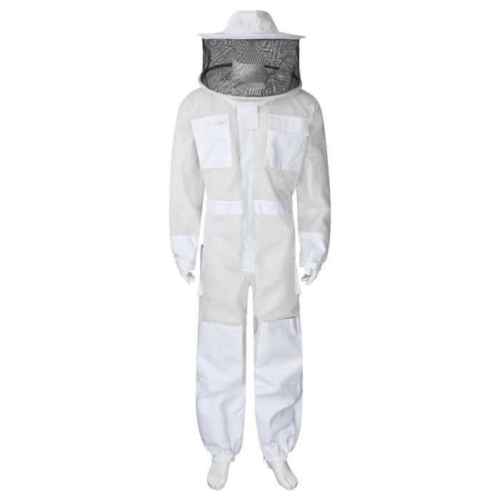 Die ventilierende Schutzbekleidung in innovativer Machart - luftig und atmend. Hergestellt in drei Lagen, weiß und voll waschbar. Angenehmer, leichter Tragekomfort gepaart mit praktischen Details wie verdecktem Reißverschluss, Taschen, einstellbaren Gummibündchen an den Ärmeln und Beinen sowie abnehmbarem Rundschleier mit reißfestem Gewebe