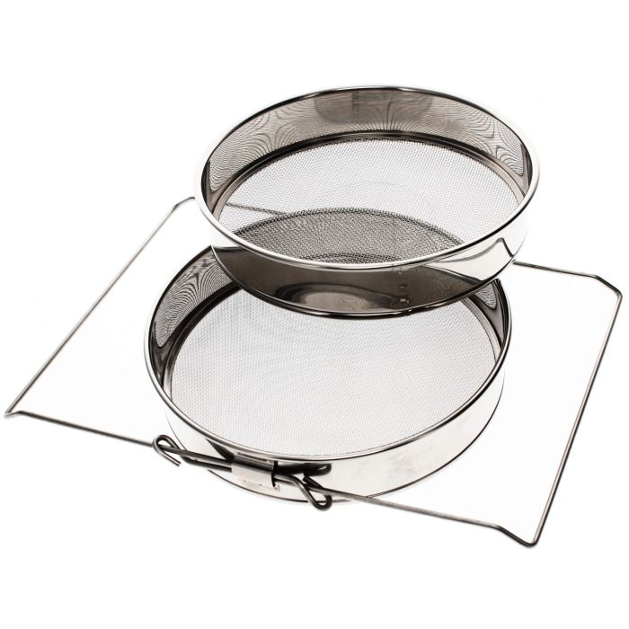 Dieses Doppelsieb ist nicht nach unten gewölbt, sondern absolut flach, daher hängt es nicht im Honig wenn der Hobbock fast voll ist