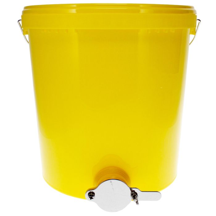 bestehend aus einem Kunststoff-Eimer 25 kg mit gelbem Deckel und einem Kunststoff-Quetschhahn mit Edestahl Frontplatte, welche den Honig sauber abschneidet.