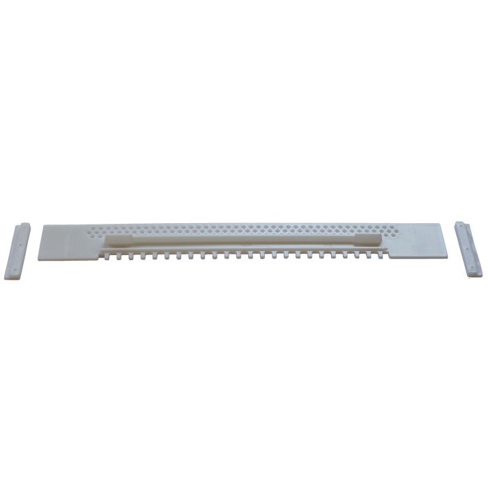 gefertigt aus Kunststoff, beidseitig nutzbar als 8 mm Mäusegitter oder als Fluglochverschluss mit Lüftung. 430 mm lang, 3-teilig mit zwei seitlichen Führungen. Insgesamt 450 mm lang (mit Führung)