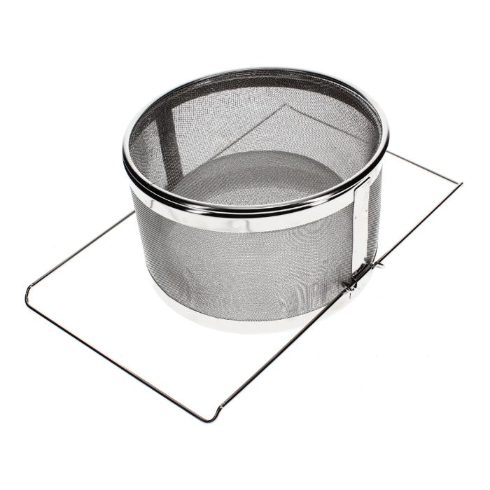 - hohes Zylinder-Feinsieb mit starkem Innenkegel und außen mit umlaufendem Vertikalfilter, mit ausziehbaren Auflagebügeln, passend für Behälter bis 38 cm