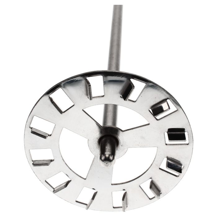 aus Edelstahl, mit Spezialrührflügel von Ø 12 cm für hohe Scherkräfte. Mit zusätzlichem, rundem Kantenschutz mit Sechskantschliff am Ende