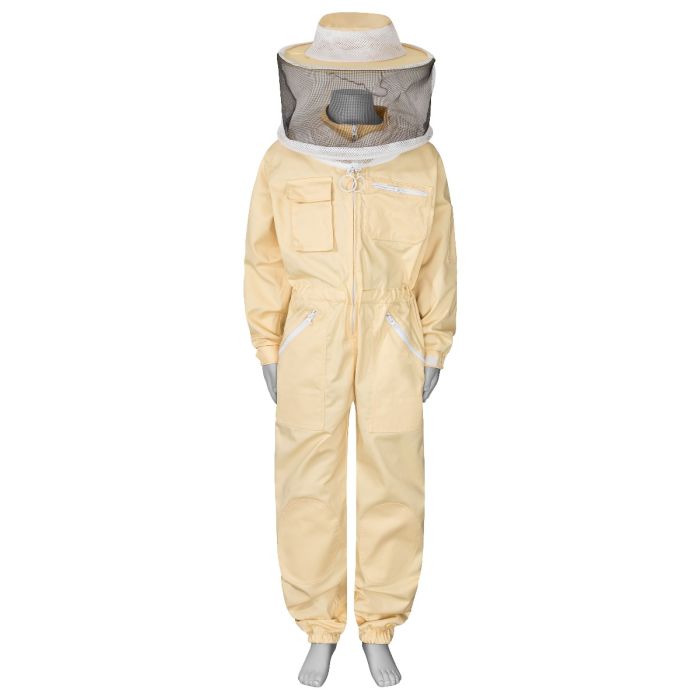 Leichte Stoffausführung in einem freundlichen, hellgelbem Farbton aus 65% Polyester und 35% Baumwolle, voll waschbar (Liebe Eltern, die Haube bitte per Hand waschen). Viele praktische Taschen mit Reißverschluss, einstellbaren Gummibündchen an den Ärmeln sowie abnehmbarer Hut-Schleier-Kombination, die auch lässig nach hinten geklappt werden kann.