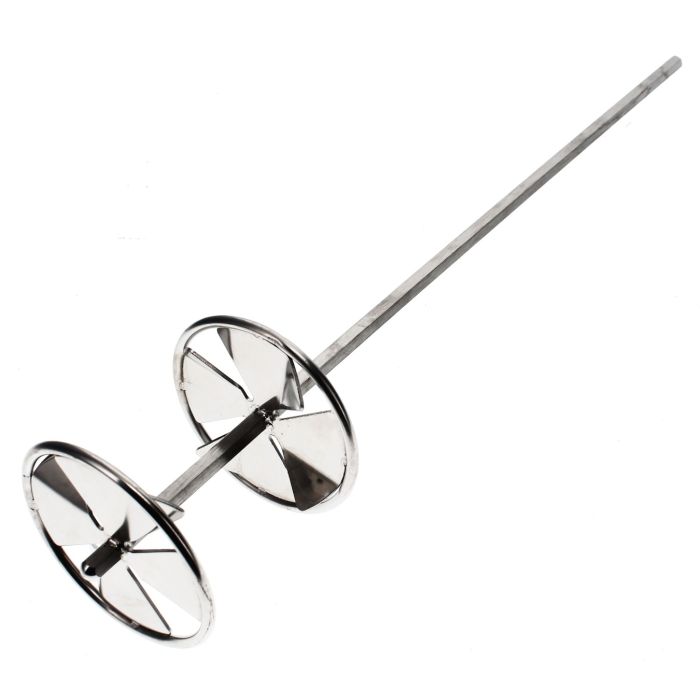 gefertigt aus Edelstahl mit zwei beweglichen und eingefassten Rührflügeln mit Ø 110 mm sowie 60cm langem Sechskantstab. Die Einfassung der Rührflügel bietet optimalen Schutz gegen Kunststoffspäne im Honig welche bei einem normalen Rührer entstehen können wenn dieser mit dem Eimer in Berührung kommt.