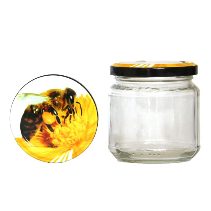 Beschreibung / Rundglas 212 ml mit 66er Twist Off Deckel Biene