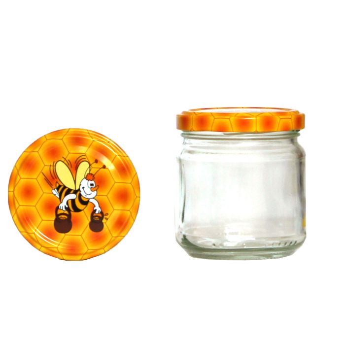 Beschreibung / Rundglas 212 ml mit 66er Twist Off Deckel Comic Biene