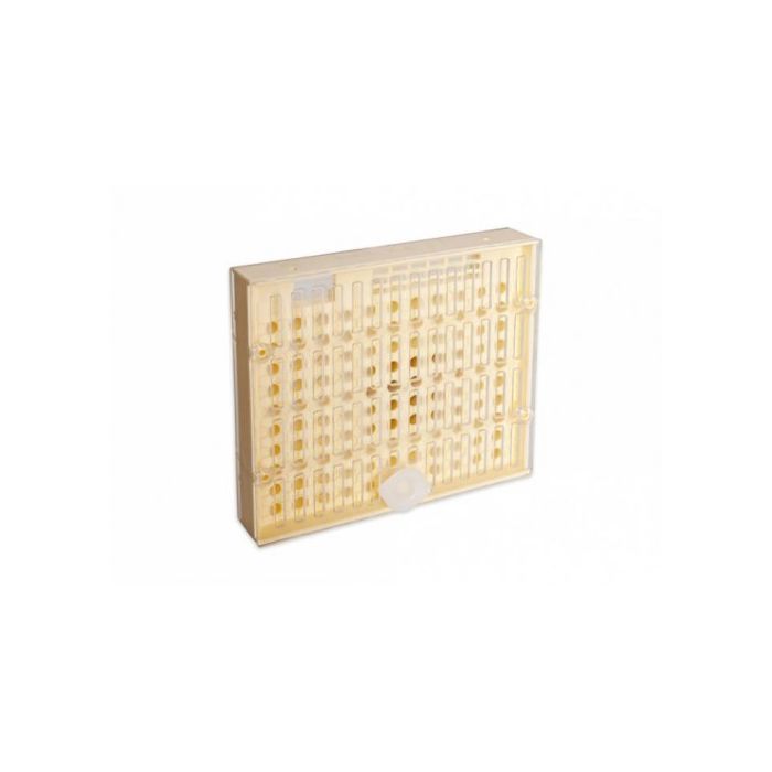 Zuchtkassette zum Käfigen der Königin und Aufstecken von bis zu 110 Weiselnäpfen. Die Königin wird durch ein Kunststoffabsperrgitter gekäfigt und stiftet direkt in die Weiselnäpfe